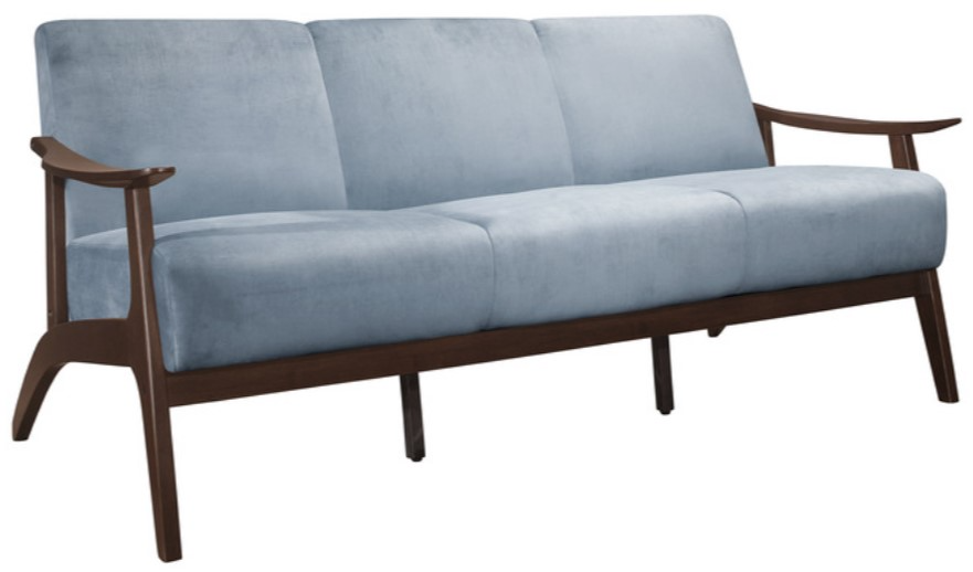 The frame of the Carlson collection recalls a time when simplicity of profile was the height of style. The streamlined design of the sofa's subtly sloped wood arms and legs is finished in dark walnut which serves to highlight the blue-gray velvet covering.Read More