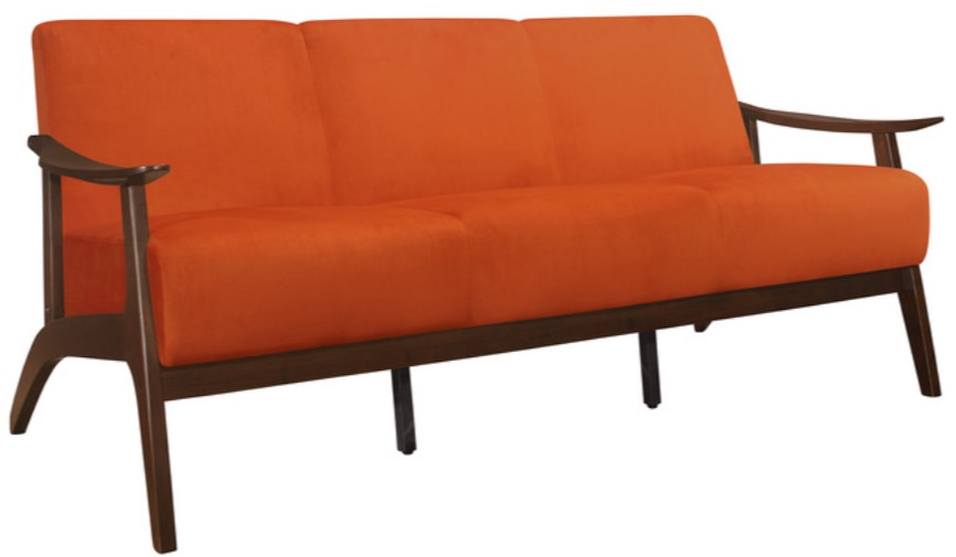 The frame of the Carlson collection recalls a time when simplicity of profile was the height of style. The streamlined design of the sofa's subtly sloped wood arms and legs is finished in dark walnut which serves to highlight the orange velvet covering.Read More