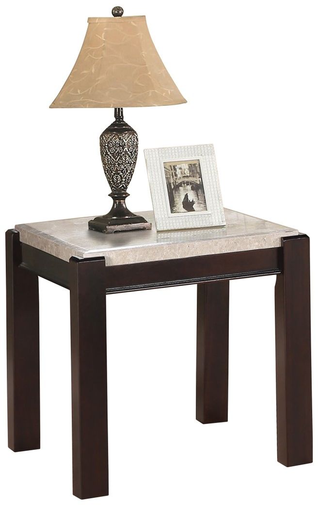 Offered for your living room is the Festus Collection. Extending to support and frame the corners of the light toned genuine marble end table top are dark cherry finished legs. At home in contemporary to transitional settings, the Festus Collection will be a stylish addition to your home. A coordinating cocktail table is also available.Read More