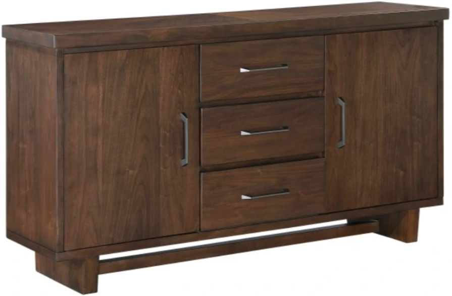 Modern lines pair with subtle rustic influence to create the design of the Franco Collection. The prominent grain of the collection’s walnut veneer is highlighted by a walnut finish. The server has behind door cabinets, and drawers that allow for storage of your tabletop accessories and feature antique nickel tone bar hardware.Read More
