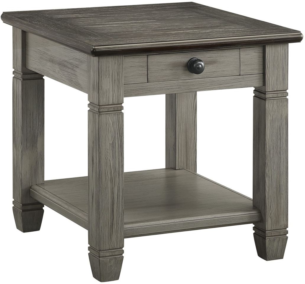 Inspired by the aesthetic of a casual country home and providing functional decorative accent for your living room is the occasional table set of the Granby Collection. The two-tone look of the acacia and pine solids base, finished in antique gray, and the oak veneer of the end table’s coffee-finished tops, present as a harmonious combination of color, perfect for your home. Dark finished metal knob hardware fronts the functional drawer while providing subtle contrast to the finish of the collection. An open display shelf creates a perfect spot for display of your decorative accessories.
