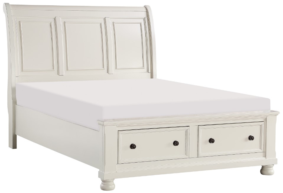 Casual transitional styling lends versatility to the placement of the Laurelin collection in a number of bedroom settings. The queen sleigh platform bed features a white finish can transition from traditional to country casual, with accents including - antiqued bronze knob hardware on the footboard’s drawer’s framed fronts and bun feet providing support.Read More