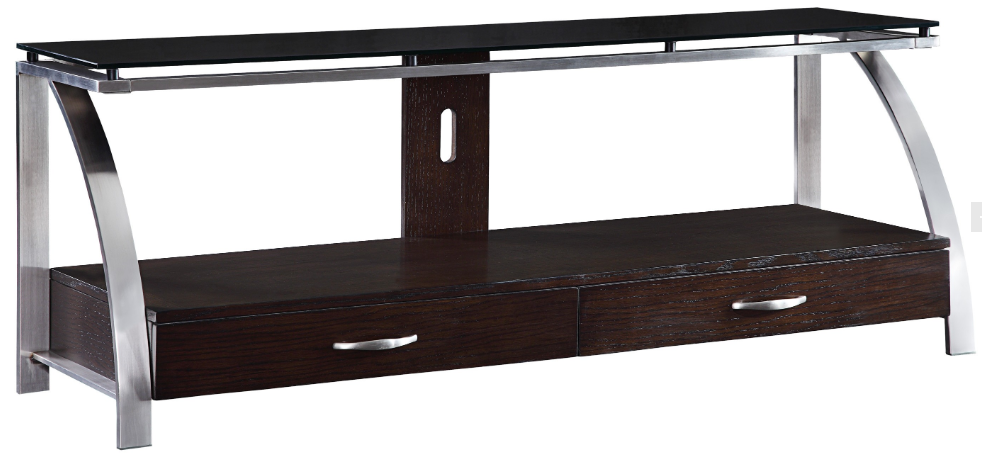 Designed for the modern home, the Tioga Collection will provide a unique look for your home entertainment space. Brushed chrome geometric support legs provide a distinct contrast to the black of the entertainment console’s floating top and espresso finish of the media access shelf. Drawers provide additional storage space.Read More