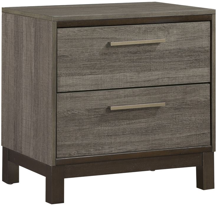 The contemporary styling of the Vestavia collection provides a unique platform from which to redecorate your bedroom. Faux wood printed veneer provides subtle texture and a gray finish perfectly contrast the dark brown base rail of the nightstand. Clean lines lend to the angular modern look and are enhanced by the antique brass tone bar pulls.Read More