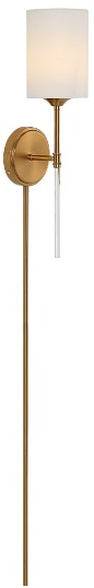 A traditional sconce in a warm brass finish modernized with a slender clear acrylic accents tall and white silken shade. Includes dual mount option with 8' of wire & plug, in-line dimmer switch, and 3-12" metal cord covers for easy plug in installation.Read More