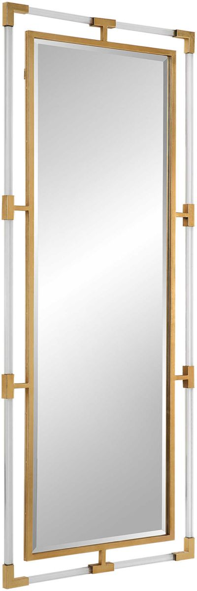 The Balkan Tall mirror features forged iron finished in a metallic gold leaf with suspended, clear acrylic solid bars creating a modern feel. Mirror has a generous 1 1/4" bevel and may be hung horizontal or vertical.Read More