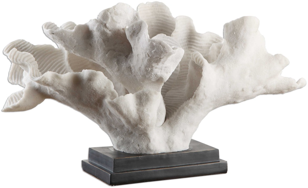 Lifelike coral in textured white, mounted on a matte black base.