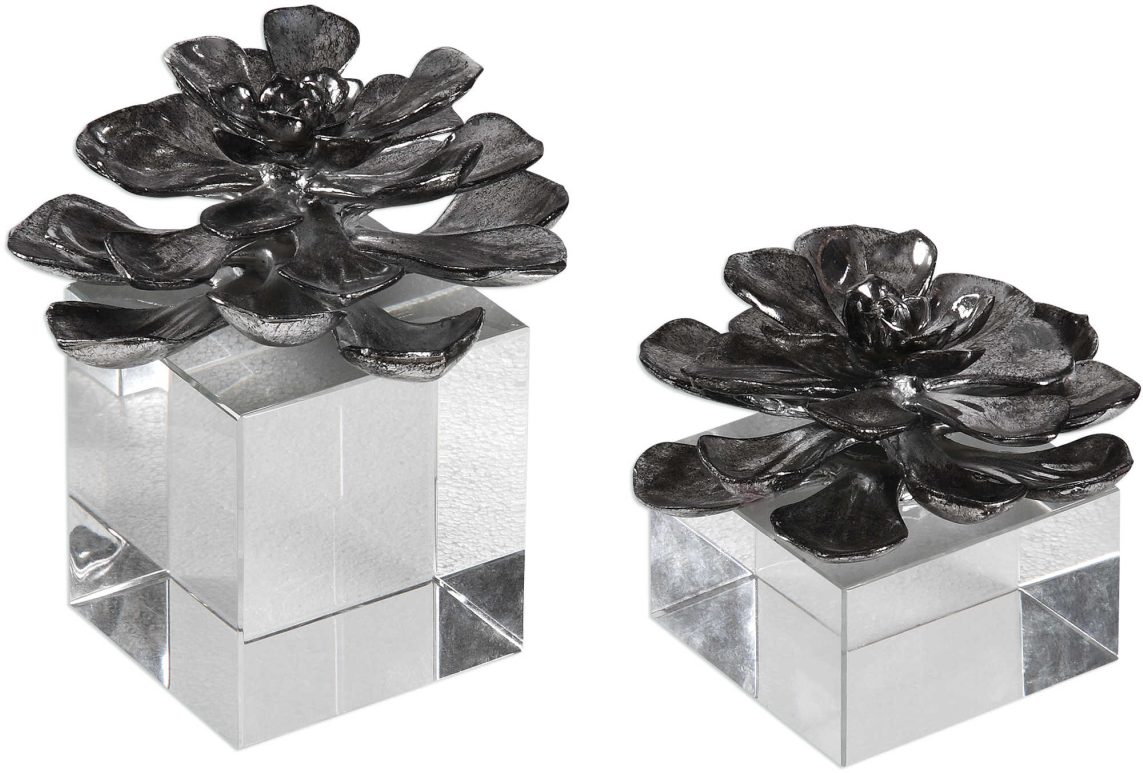 Simple elegance is achieved by these antiqued, metallic silver lotus blooms that appear to be floating on clear crystal cubes. Sizes: Sm-6x5x6, Lg-6x7x6Read More