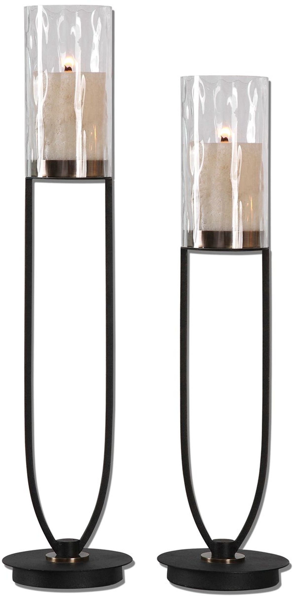 Matte Black Open Design Iron Work With Coffee Bronze Details, Clear Water Glass Globes And Two, 4"x 5" Distressed Beige Candles. Sizes: Sm-7x27x7, Lg-7x31x7Read More