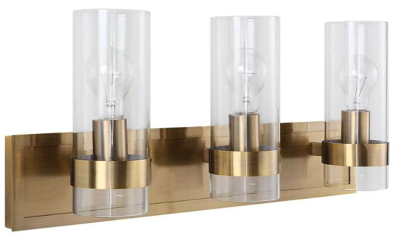 Clean modern lines enhance this 3 light vanity featuring a wide ring holding the clear cylinder glass yielding a floating effect, finished in warm oxidized antique brass. With 3-60 watt max, Edison sockets.Read More