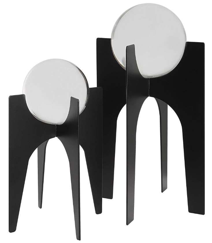 This 2 piece crystal sphere from Uttermost is elevated on iron bases finished in a brushed black. Make a bold statement by incorporating this stunning home decor into your home.Read More