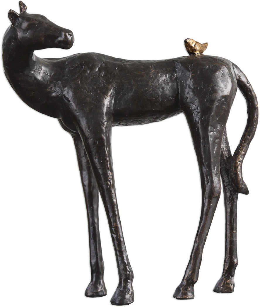 This playful, cast iron, sculpture features a dark brown horse with light bronze tipping turned to greet the antique gold bird that has positioned itself on his back. This will add a cheerful addition to any setting.