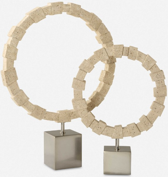 Elevate your space with our captivating ring sculptures, meticulously crafted from multiple sizes of unique cast ivory man-made stone, resembling the timeless beauty of travertine. Each piece is elegantly elevated on brushed nickel metal bases, exuding modern sophistication and artistic charm. Sizes: S- 13x17x13, L- 17x23x17Read More