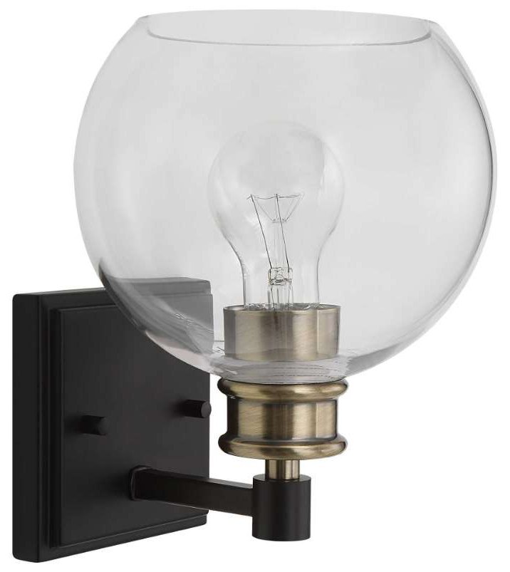 Timeless lines make this 1 light sconce an understated classic. Finished in a combination of matte black & plated antique brass then topped with sparkling clear round glass shade. With 1-60 watt max, Edison socket.Read More