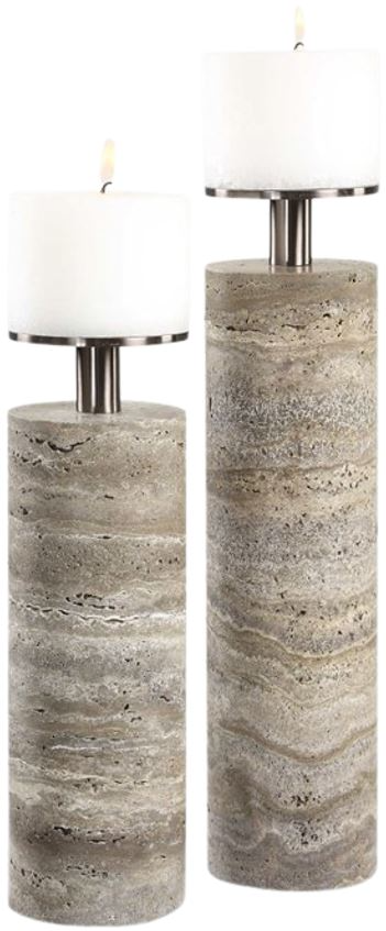 Illuminate your space with sophistication using these cylinders of unfilled gray travertine featuring dark bronze metal candle cups. Crafted for elegance and durability, these candleholders add a touch of refined ambiance to any room. Since it is a natural stone, each piece of travertine is unique.Read More