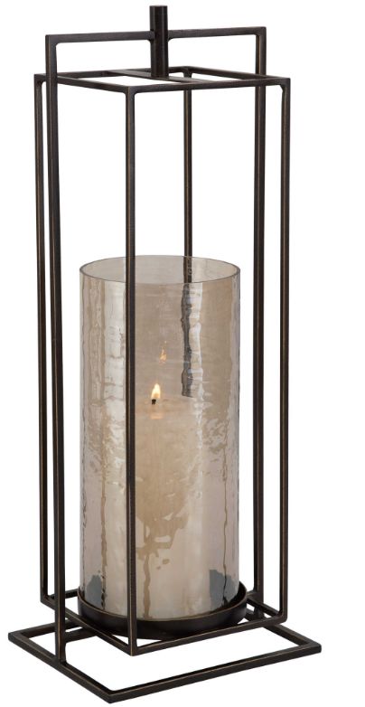 Illuminate your space with a warm glow from this textured glass and iron candle lantern. Designed to hold a pillar candle, it features a removable textured glass hurricane and iron stand finished in dark bronze with gold rub-through details.Read More
