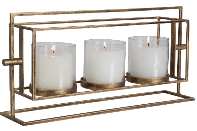 Illuminate your space with a warm glow from this textured glass and iron triple candle lantern. Designed to hold three pillar candles, it features removable textured clear glass hurricanes and iron stand with antique gold finish.Read More