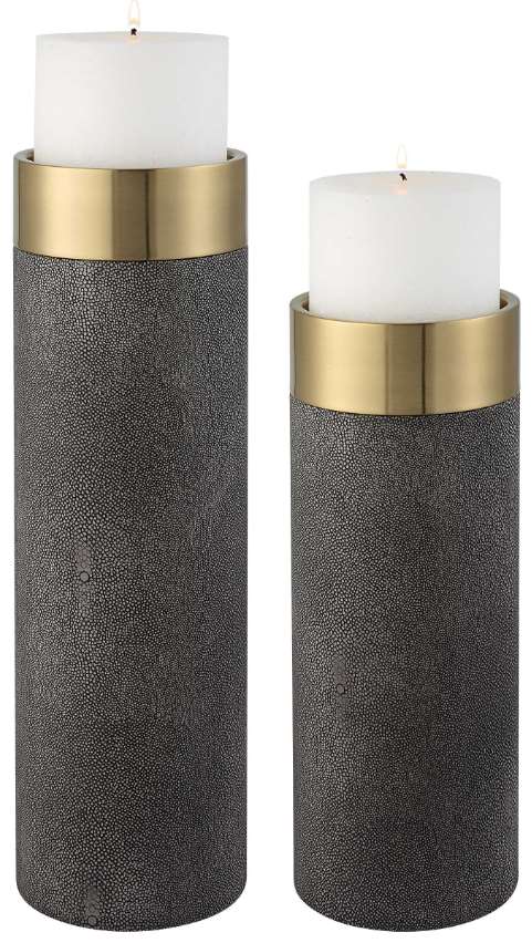 A set of two pillar candleholders is covered in a gray faux shagreen with iron candle cups finished in antique brushed brass. Two, 4" x 3" white candles are included. Make a bold statement by incorporating this stunning home decor into your home.Read More