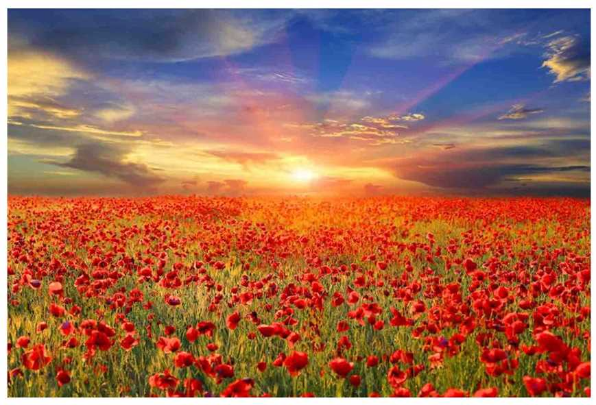 This frameless glass art piece shows the beautiful colors of a poppy field. The horizon shows the dusk through a rainbow of colors. Blue skies and wispy clouds begin to disappear through the setting sun's rays showing all the beauty nature has to offer.Read More