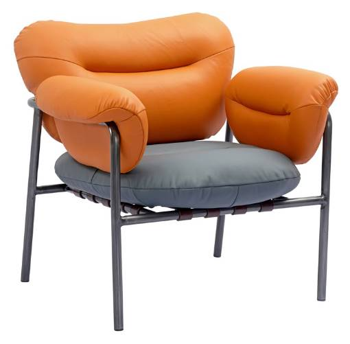 The chair's backrest and arms are upholstered in orange leather that adds warmth and vibrancy to the room, while the contrasting seating in gray leather is supple and soft to the touch, providing a comfortable seating experience. It has enough padding to offer a comfortable and relaxing seat. The chair's frame and legs are made from a sturdy metal in a sleek and modern shade of grey. The legs are streamlined to provide a sense of lightness and elegance to the design. Aurea would be a bold and stylish statement piece that adds both comfort and visual interest to any space. Its modern design and vibrant colors would make it a standout feature in a contemporary living room, home office, or lounge area.