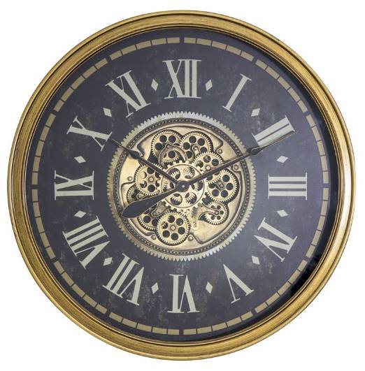 This Roman Gear clock showcases a gold-painted wooden frame that surrounds an aged, antique-looking clock face. The large Roman numerals stand out against the dark background which makes them easy to read from a distance. At 31 inches wide by 31 inches tall, this commanding clock will make the perfect statement piece for any home or office.Read More