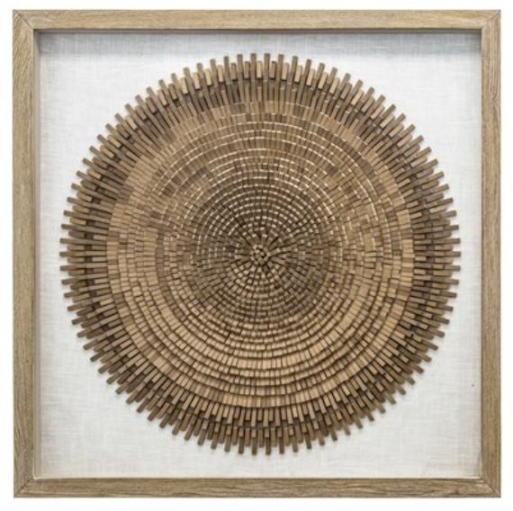 Pieces of MDF are staggered stacked in a circular motion to form this curious shadowbox art. The design is mounted on a linen backdrop behind glass and finished with a light wooden frame.Read More