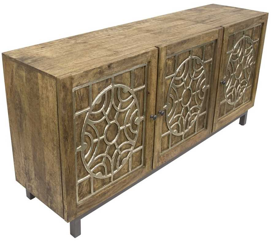 Made from solid mango wood and crafted with meticulous attention to detail, this console showcases intricate woodwork and a refined pattern on each door. The details of the symmetrical, hand-carved design are accentuated by a lustrous golden metal foil, adding elegance to the piece.Read More