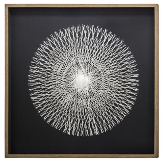 The reflective center grounds the white twine of this piece onto the dark linen backdrop. The dark wood frame completes the look that can be used in almost any decor.Read More