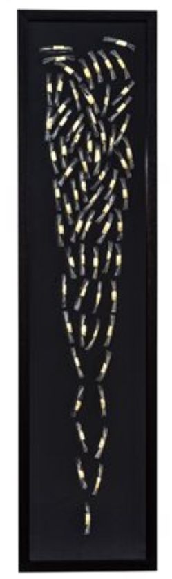 Strips of gold tipped acrylic pieces form this 3D shadowbox art. The black frame and black linen under glass add to the interesting look of this piece. Elevate your room design by incorporating this wall art piece.Read More