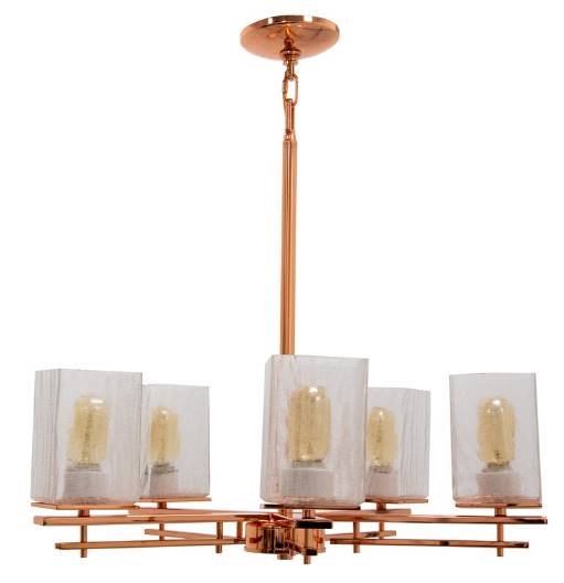 This stunning fixture features five arms in a soft copper finish. The square clear crackle glass shades provide an abundance of light, all while providing a controlled amount of light diffusion. The 10' chain and 12' wire enable this piece to be used in various spaces.Read More