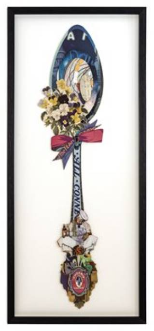 This artwork is a twist on nostalgic wall decor. Thick layers of patterns form an everyday object embellished with color and small details. Details such as the blue and dark pink ribbon holding a cream and green bouquet, or the chef at the stem.Read More