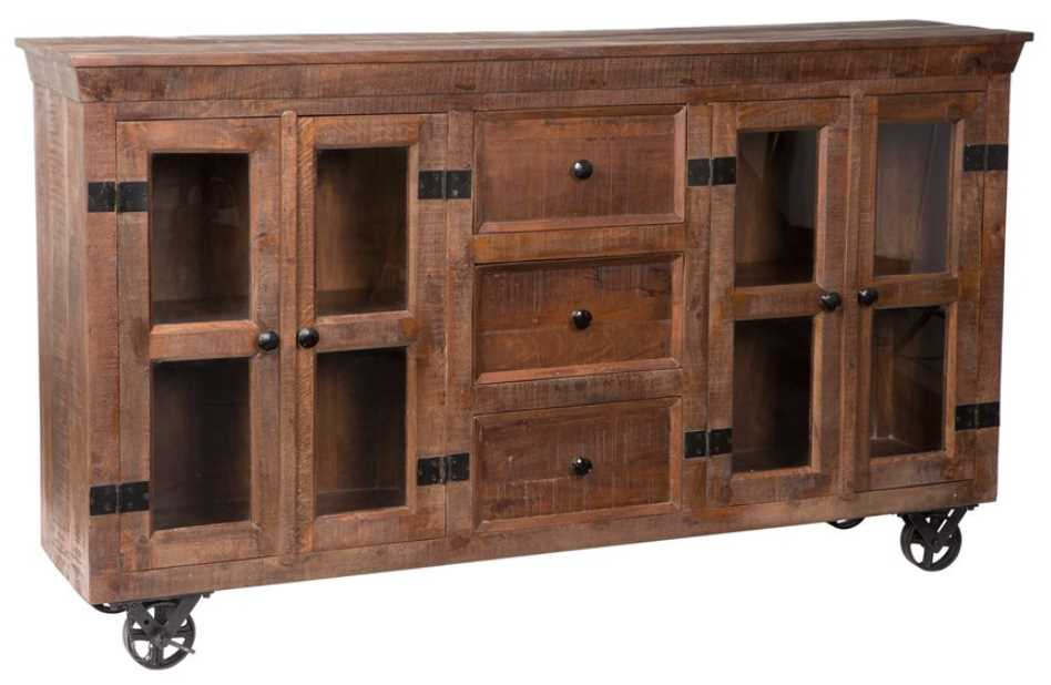 This solid mango wood four-door cabinet features classic glass panel doors. Three center drawers and two inner shelves provide ample storage space. The warm, natural-finished cabinet, accented with hammered metal hardware, rests steadily on four cast-iron wheels with safety pin stops.Read More